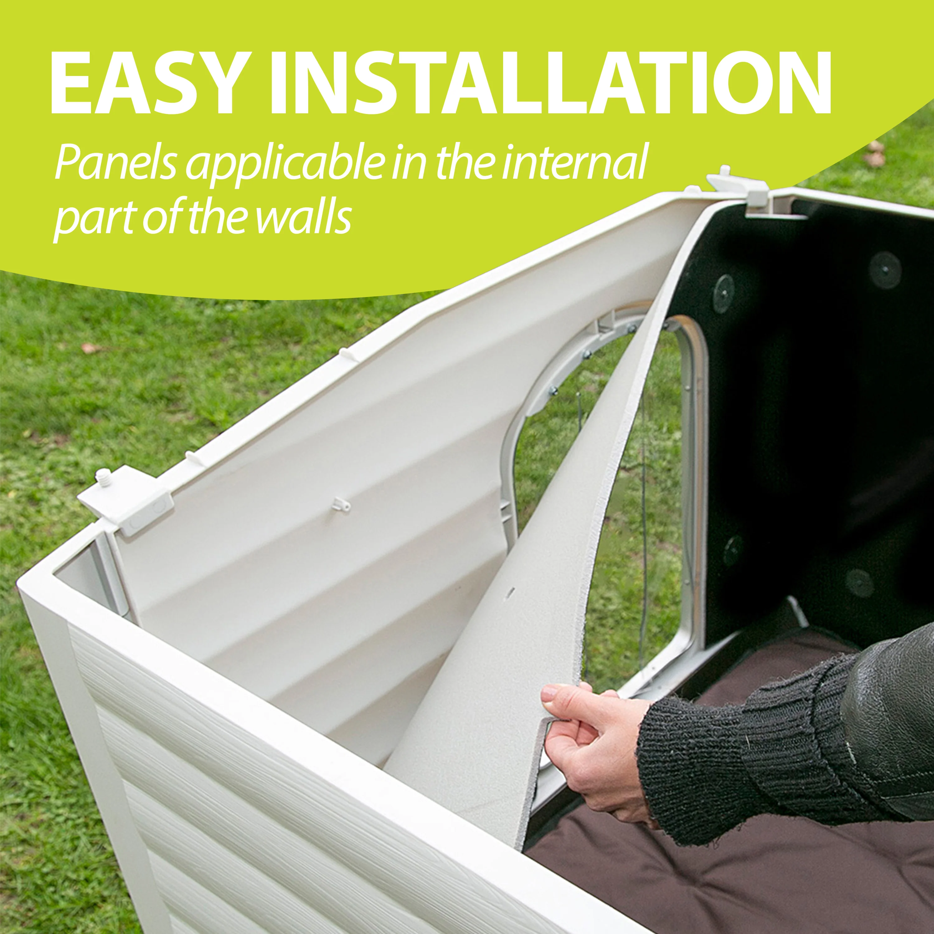 Vendido por separado, es un kit completo de paneles aislantes para la caseta Dogvilla. Los paquetes incluyen 6 paneles de insulación de PVC, encontrará seis paneles de aislamiento de PVC que se pueden aplicar fácilmente al interior de las cuatro paredes y al techo. Muy útiles tanto en invierno, para retener el calor, como en verano, para protegerse de la radiación solar, se pueden aplicar según sea necesario: de hecho, cuando el clima es más cálido es recomendable utilizar solo dos paneles, necesarios para proteger el techo de de los rayos del sol, mientras que en la época fría es recomendable aislar todas las superficies, sustituyendo también la pared de apertura de la caseta por la pared fija que encuentras incluida en el kit (excepto modelo 50). Para adaptarse a todos los modelos de Dogvilla, los paneles aislantes Dogvilla están disponibles en diferentes tamaños. Gracias a este accesorio, la casa de tu perro se volverá aún más cómoda, protegiéndola eficazmente de las inclemencias del tiempo y las temperaturas adversas.