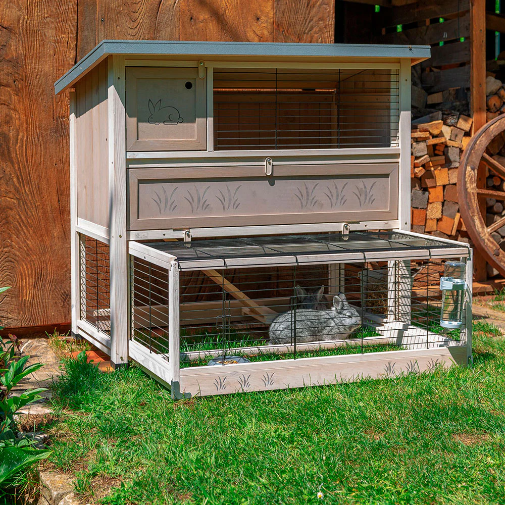La conejera para conejos está equipada con un gran cajón central extraíble, ideal para recoger suciedad, residuos de alimentos o basura, oculta por una puerta de madera plegable que puede cerrarse con ganchos especiales y un techo completamente abrible con un brazo de soporte. Más abajo, además, está equipado con una cubierta de cierre, muy práctica durante las operaciones de limpieza, y un borde elevado para evitar que la cama se caiga.