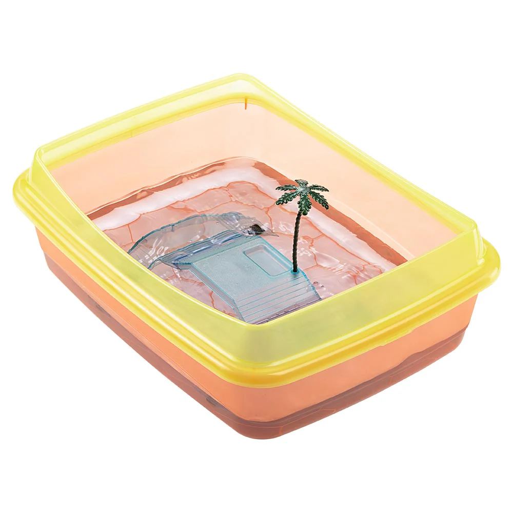 Tortugas es un agradable tanque de tortugas hecho de plástico coloreado que consta de un gran fondo y un práctico marco que podrá quitar para limpiar. Este tanque para las tortugas se vende completo con isla con ventosas y pequeñas palmeras; la isla puede ser fijada firmemente en la parte inferior, está equipado con un pequeño escalón y plataforma inclinada. Gracias a su particular borde, Tortugas evita salpicaduras de agua hacia afuera y es perfecto para tener pequeños reptiles juntos.